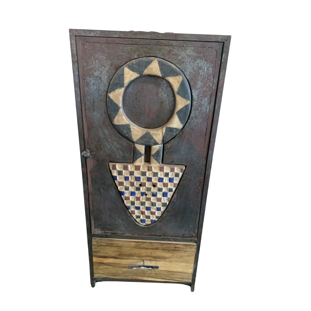 Le contraste entre le fer et le bois fait de cette armoire une pièce maîtresse qui allie solidité et élégance. Chaque élément est sélectionné avec soin pour garantir non seulement la durabilité, mais aussi une esthétique intemporelle. Cette armoire n’est pas qu’un meuble, c’est une œuvre qui porte en elle l’histoire de ses créateurs. Chaque symbole, chaque finition raconte le travail minutieux et la passion des artisans.