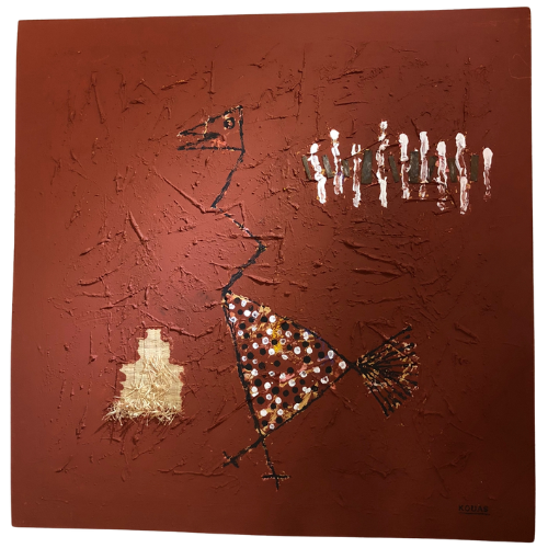 Dieu de la Terre est une Ćuvre puissante de Kouas, oĂč la matiĂšre mĂȘme â la terre rouge â semble incarner le souffle sacrĂ© des origines. Ă travers cette peinture, lâartiste cĂ©lĂšbre les divinitĂ©s tutĂ©laires enracinĂ©es dans le sol africain, les forces invisibles qui nourrissent, protĂšgent et gouvernent les cycles de la vie. Entre abstraction et spiritualitĂ©, Kouas nous invite Ă contempler le lien profond entre lâhomme, la nature et le divin.