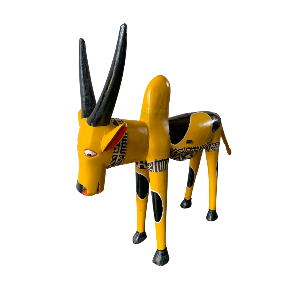 Apportez une touche de culture africaine et de poésie visuelle à votre espace avec cette marionnette de vache Bozo, symbole d’art et de transmission.