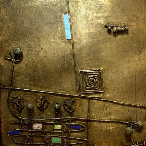 Musiciens traditionnels est une Ćuvre saisissante de lâartiste Kouas, mĂȘlant textures mĂ©talliques, symboles graphiques et objets intĂ©grĂ©s. Sur un fond dorĂ© patinĂ©, des formes abstraites et stylisĂ©es rappellent des silhouettes de musiciens, ancrĂ©s dans une symphonie de lignes et de spirales. Les matĂ©riaux, intĂ©grĂ©s comme des instruments ou des ornements, Ă©voquent les percussions et les chants anciens, dans une scĂšne intemporelle.